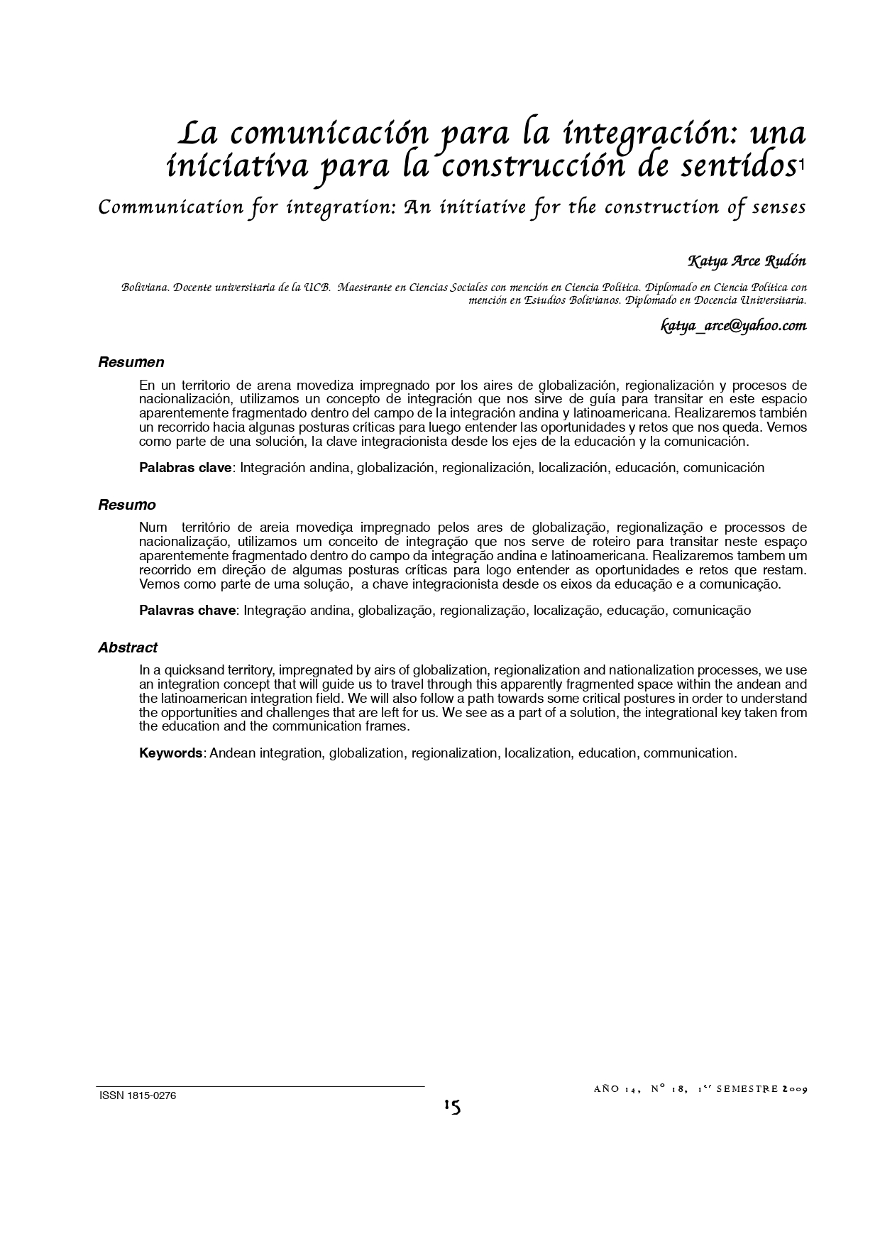 En un territorio de arena movediza impregnado por los aires de globalización, regionalización y procesos de nacionalización, utilizamos un concepto de integración que nos sirve de guía para transitar en este espacio aparentemente fragmentado dentro del campo de la integración andina y latinoamericana. Realizaremos también un recorrido hacia algunas posturas críticas para luego entender las oportunidades y retos que nos queda. Vemos como parte de una solución, la clave integracionista desde los ejes de la educación y la comunicación.