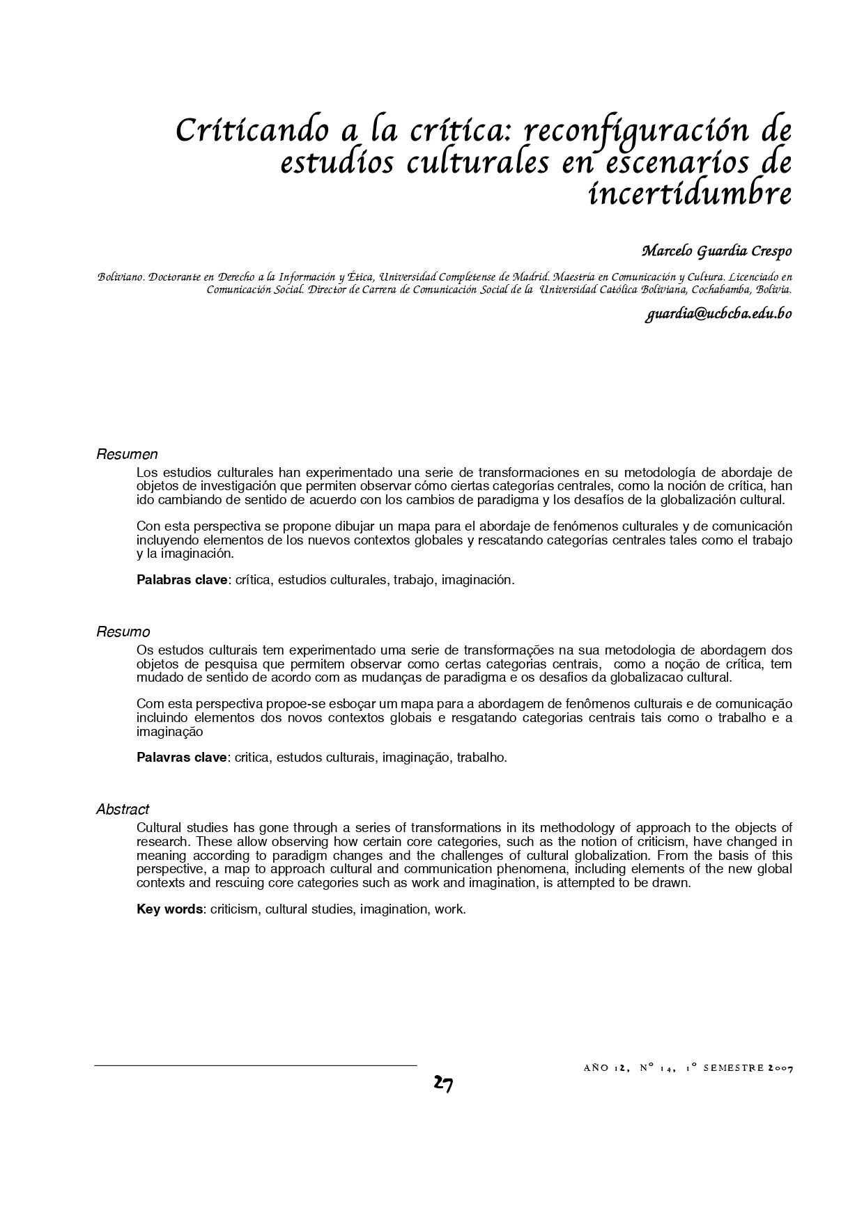crítica, estudios culturales, trabajo, imaginaciónResumen