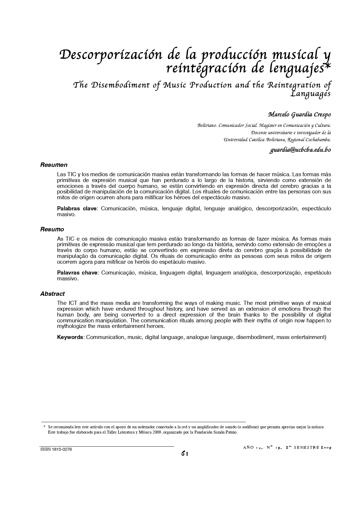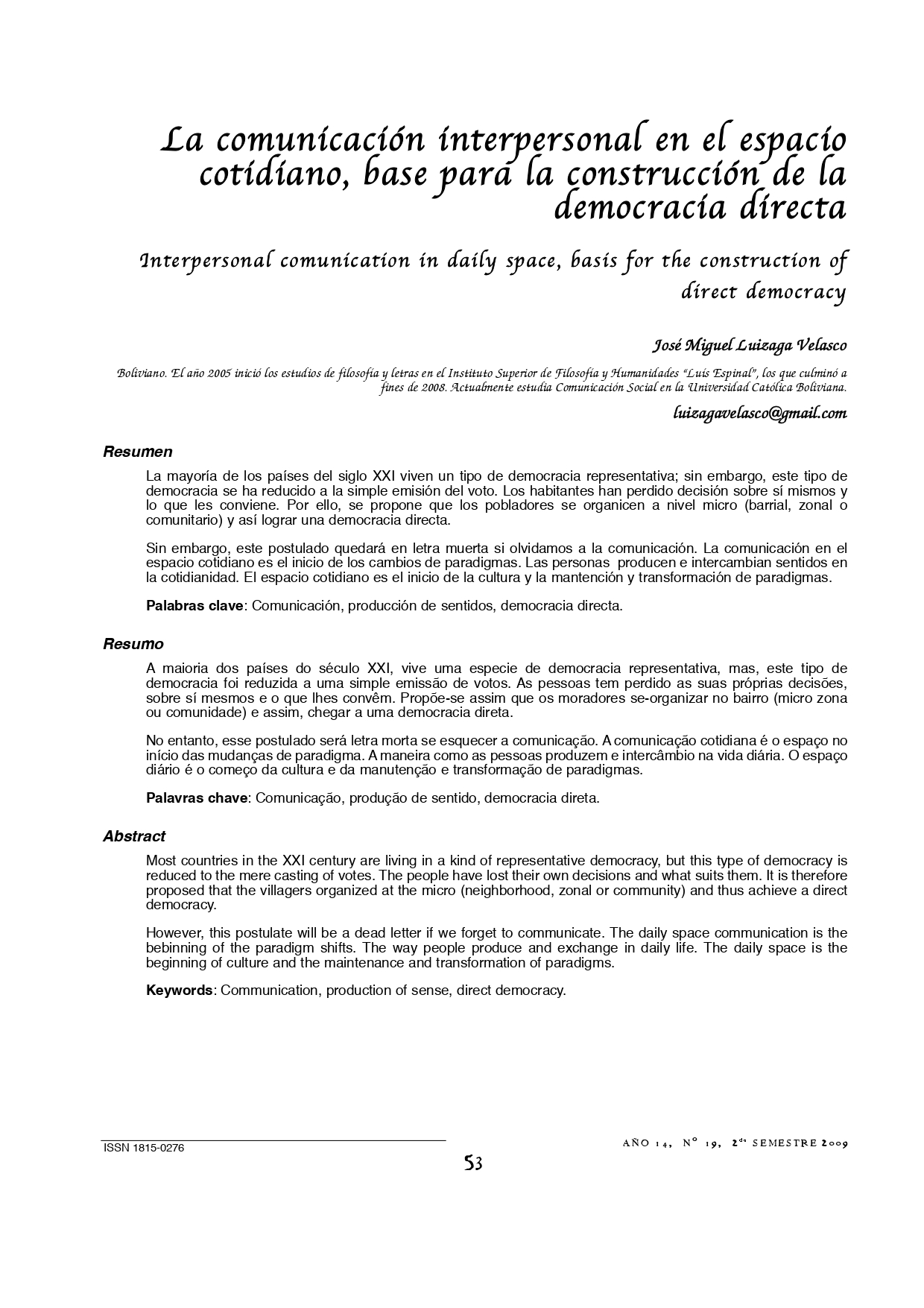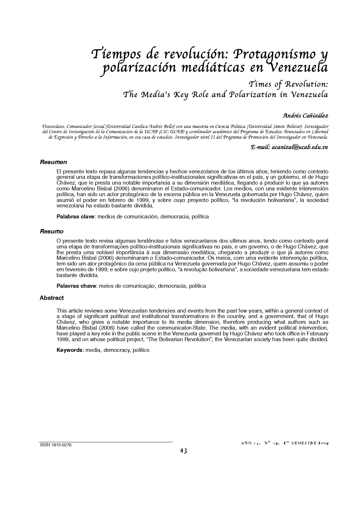Vol. 14 Núm. 19 (2009): Revista Punto Cero No. 19