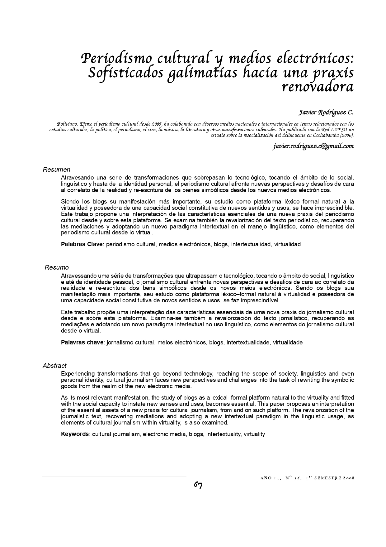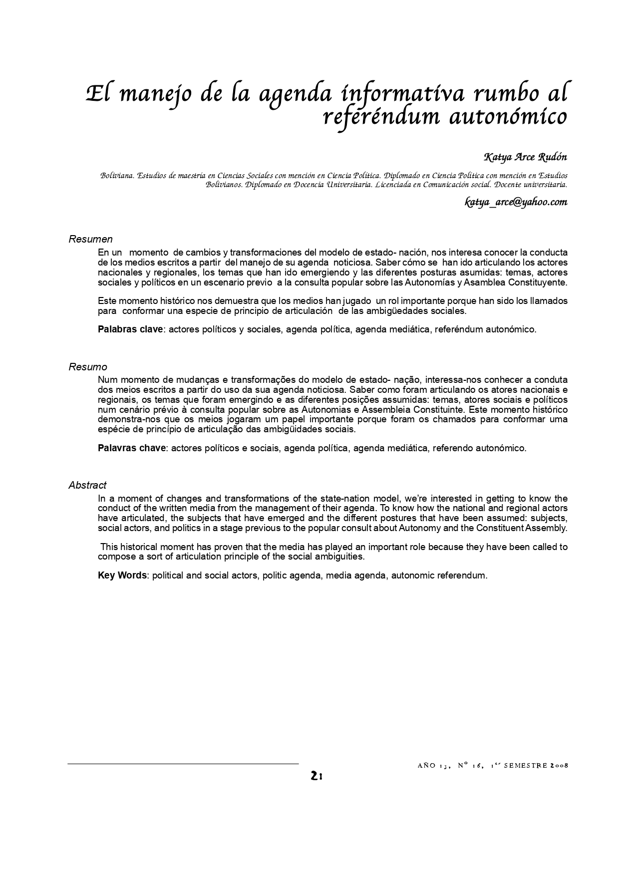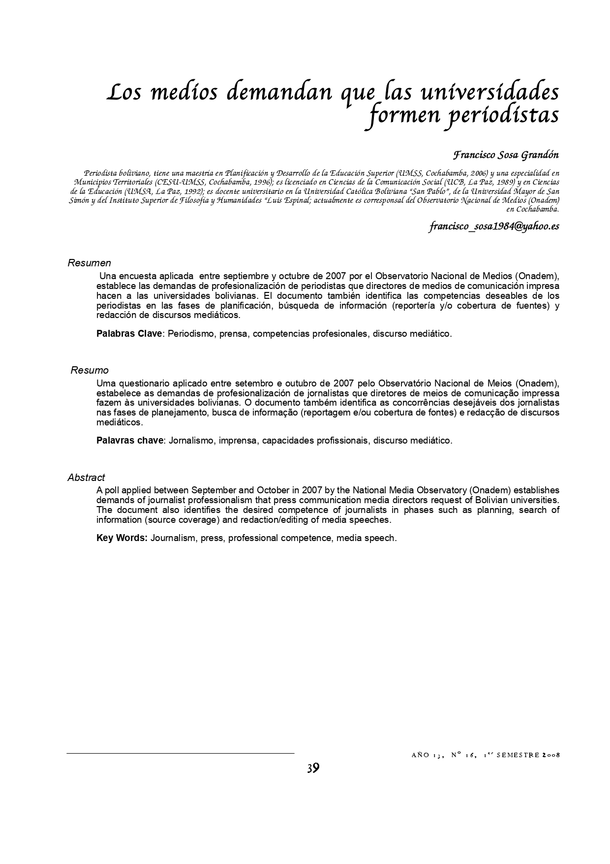 Vol. 13 Núm. 16 (2008): Revista Punto Cero No. 16
