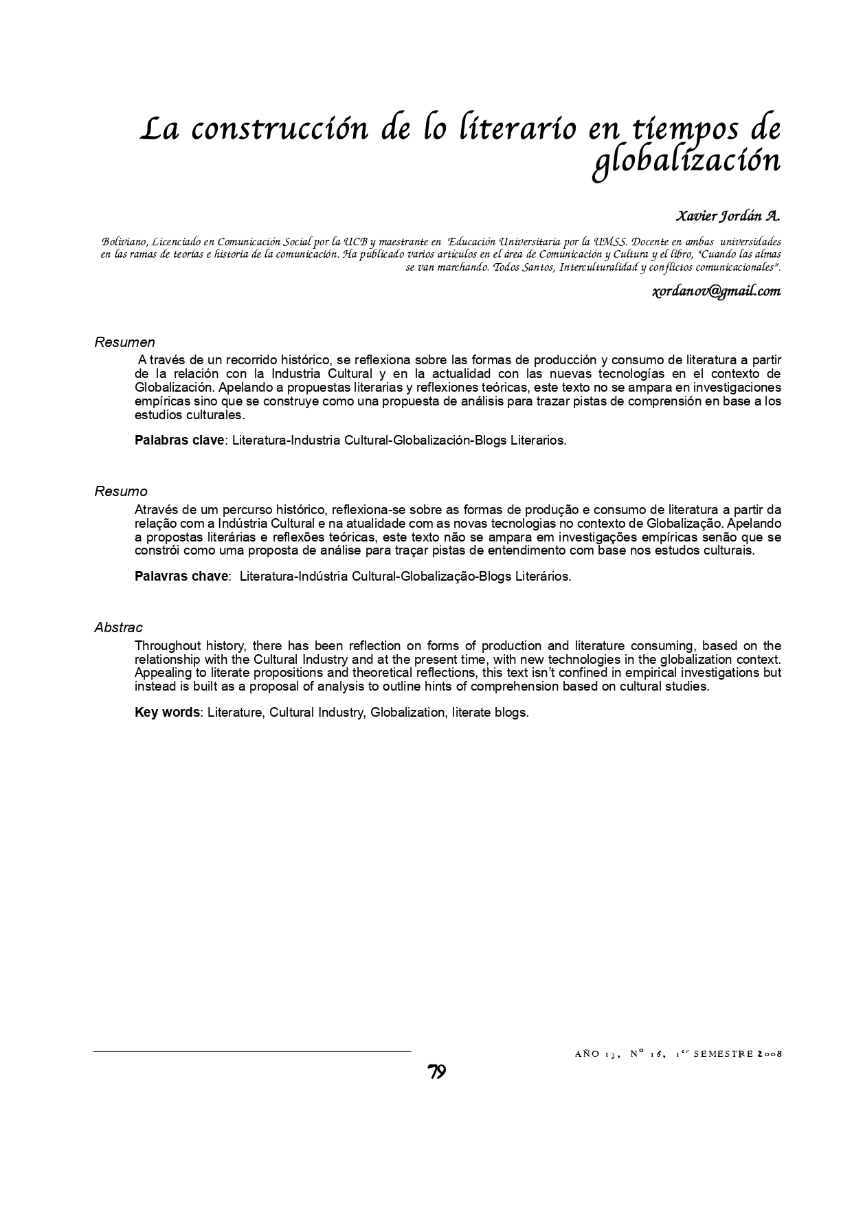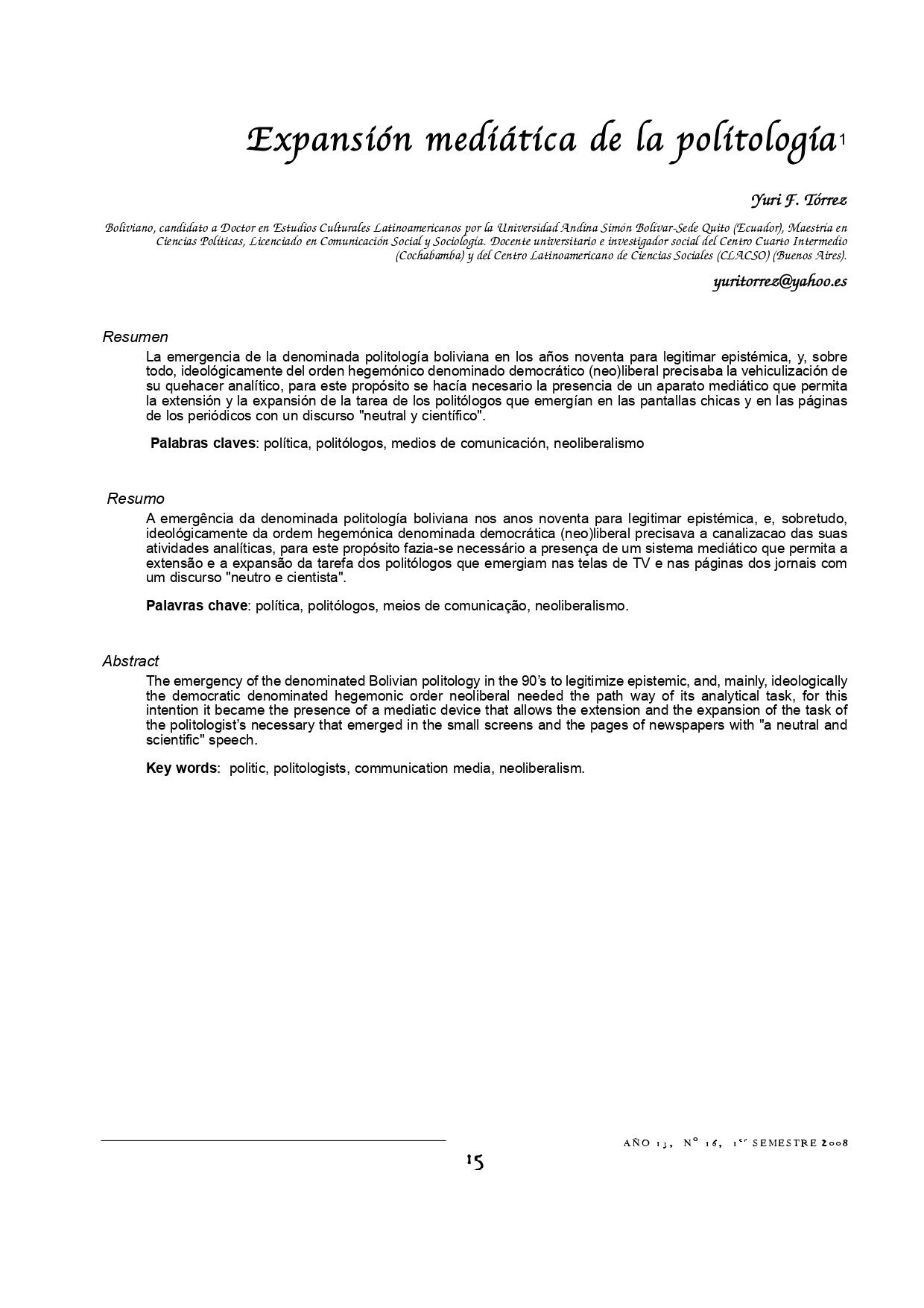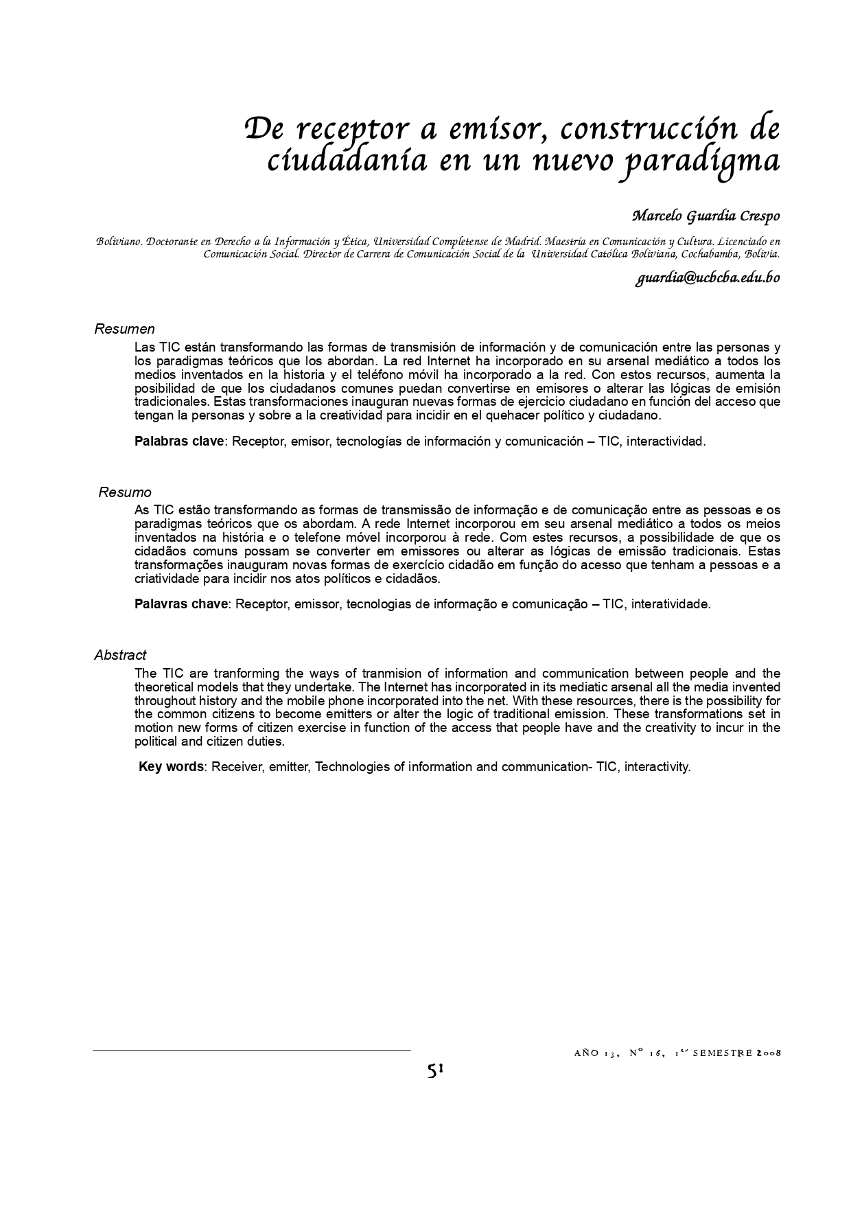 Vol. 13 Núm. 16 (2008): Revista Punto Cero No. 16