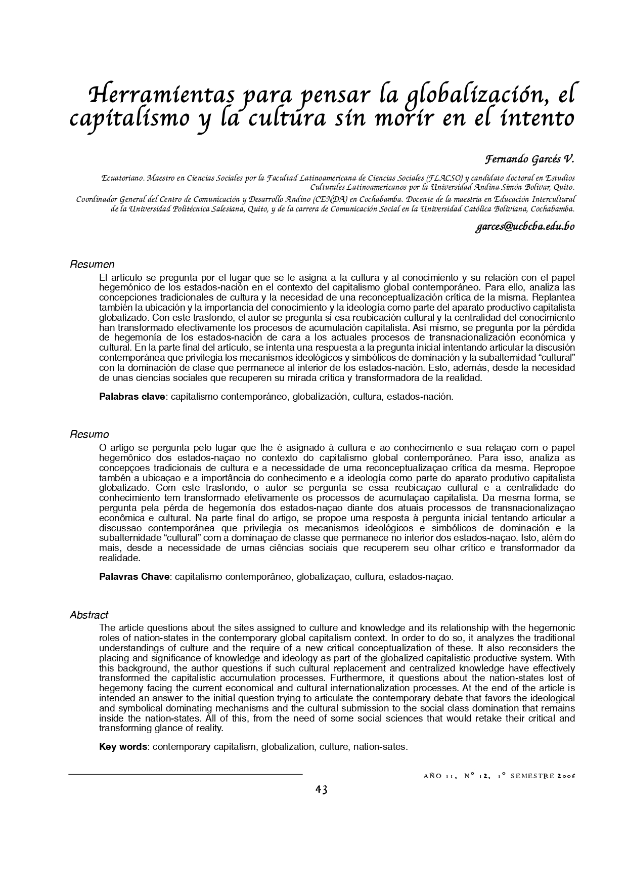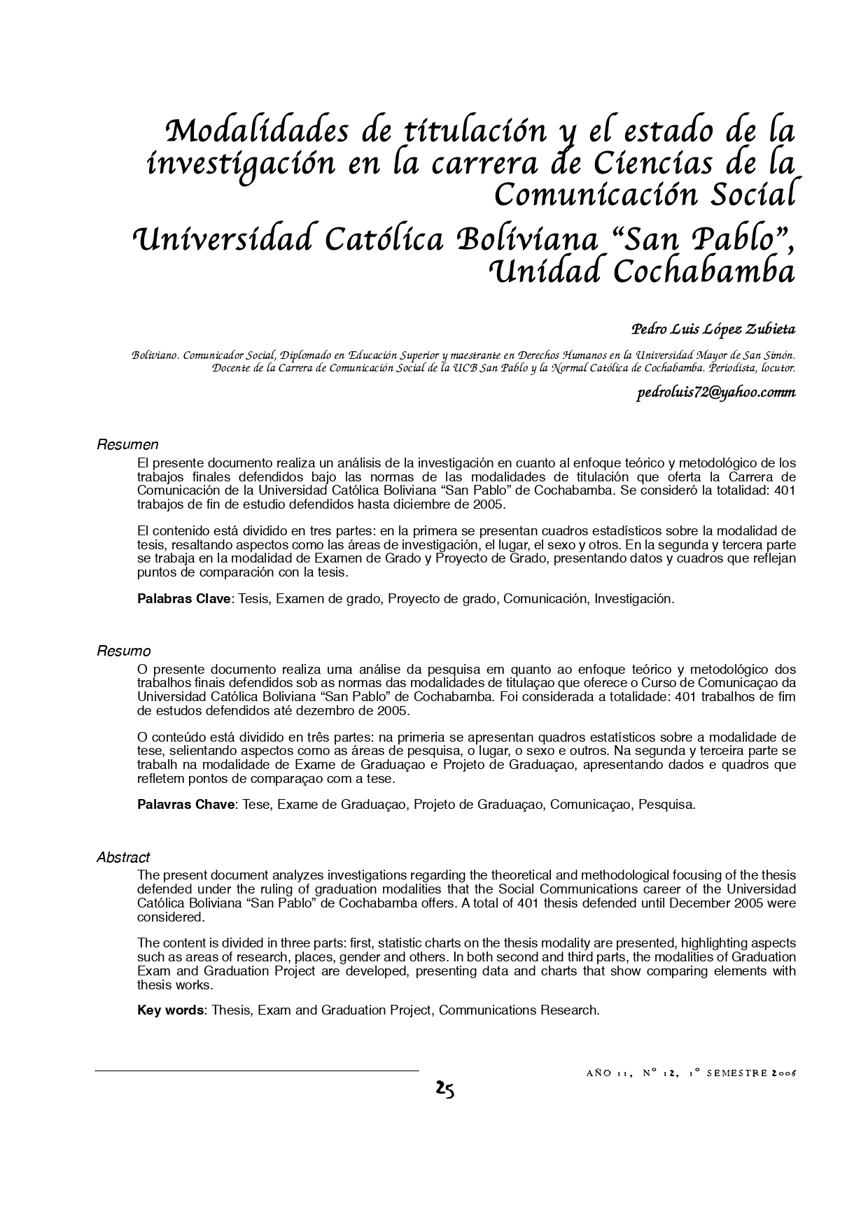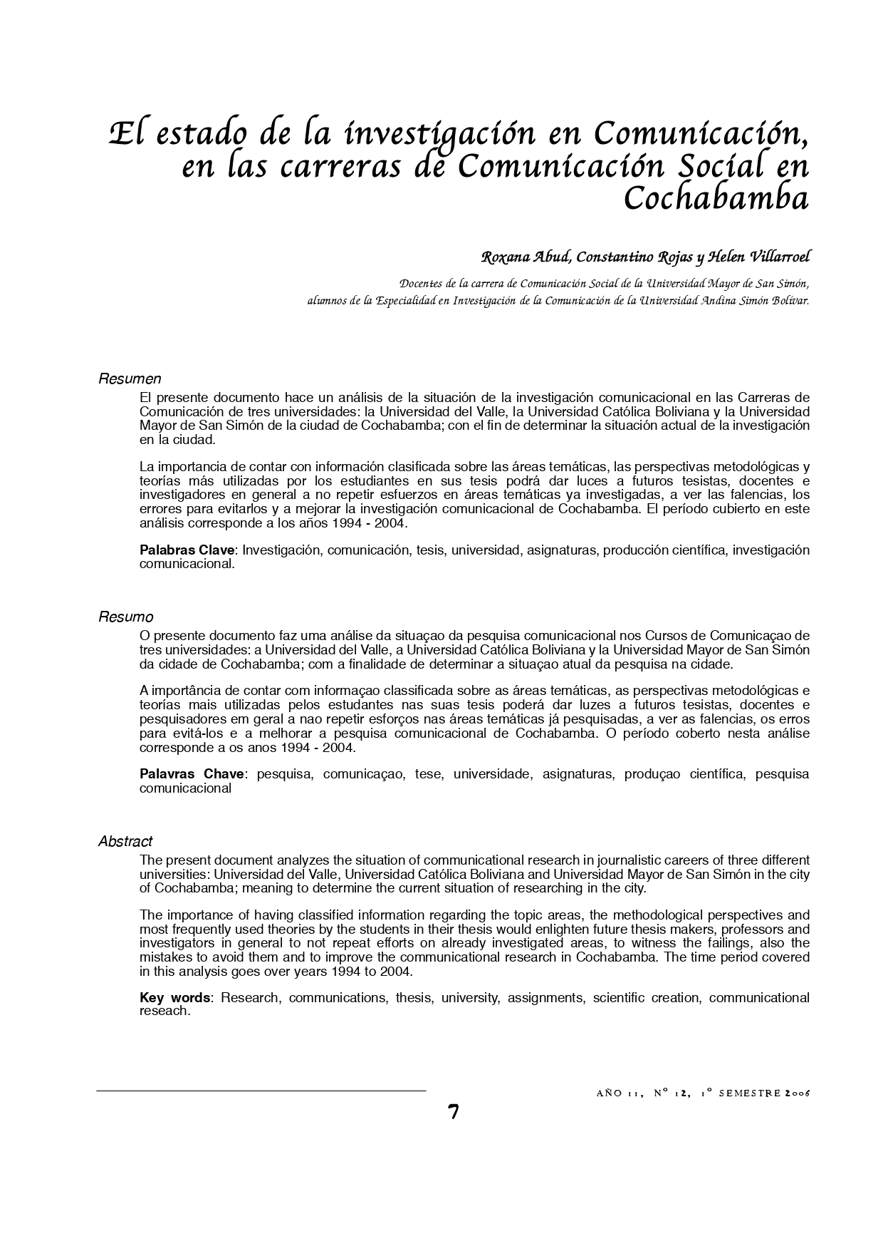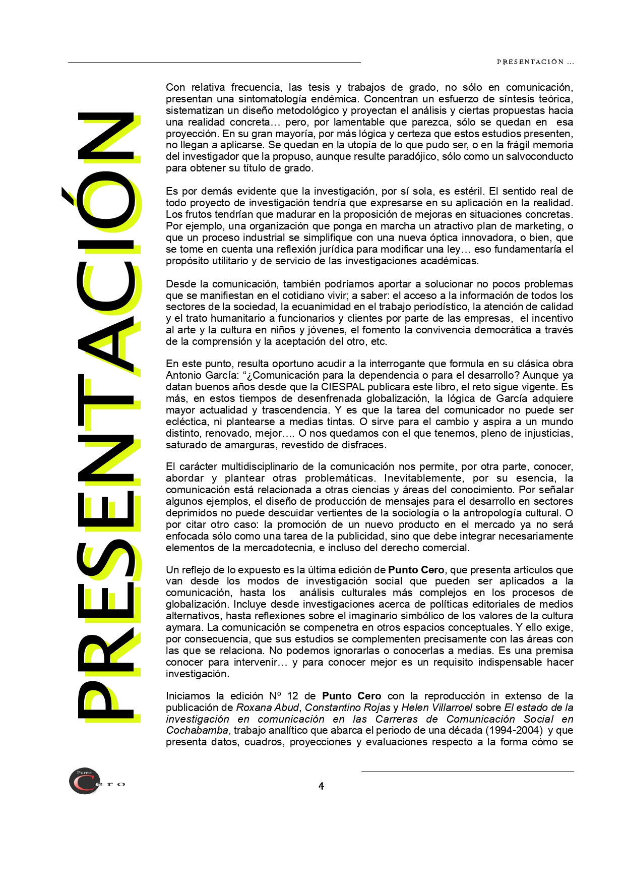 La última edición de Punto Cero, que presenta artículos que van desde los modos de investigación social que pueden ser aplicados a la comunicación, hasta los análisis culturales más complejos en los procesos de globalización. Incluye desde investigaciones acerca de políticas editoriales de medios alternativos, hasta reflexiones sobre el imaginario simbólico de los valores de la cultura aymara. La comunicación se compenetra en otros espacios conceptuales. Y ello exige, por consecuencia, que sus estudios se complementen precisamente con las áreas con las que se relaciona. No podemos ignorarlas o conocerlas a medias. Es una premisa conocer para intervenir… y para conocer mejor es un requisito indispensable hacer investigación.