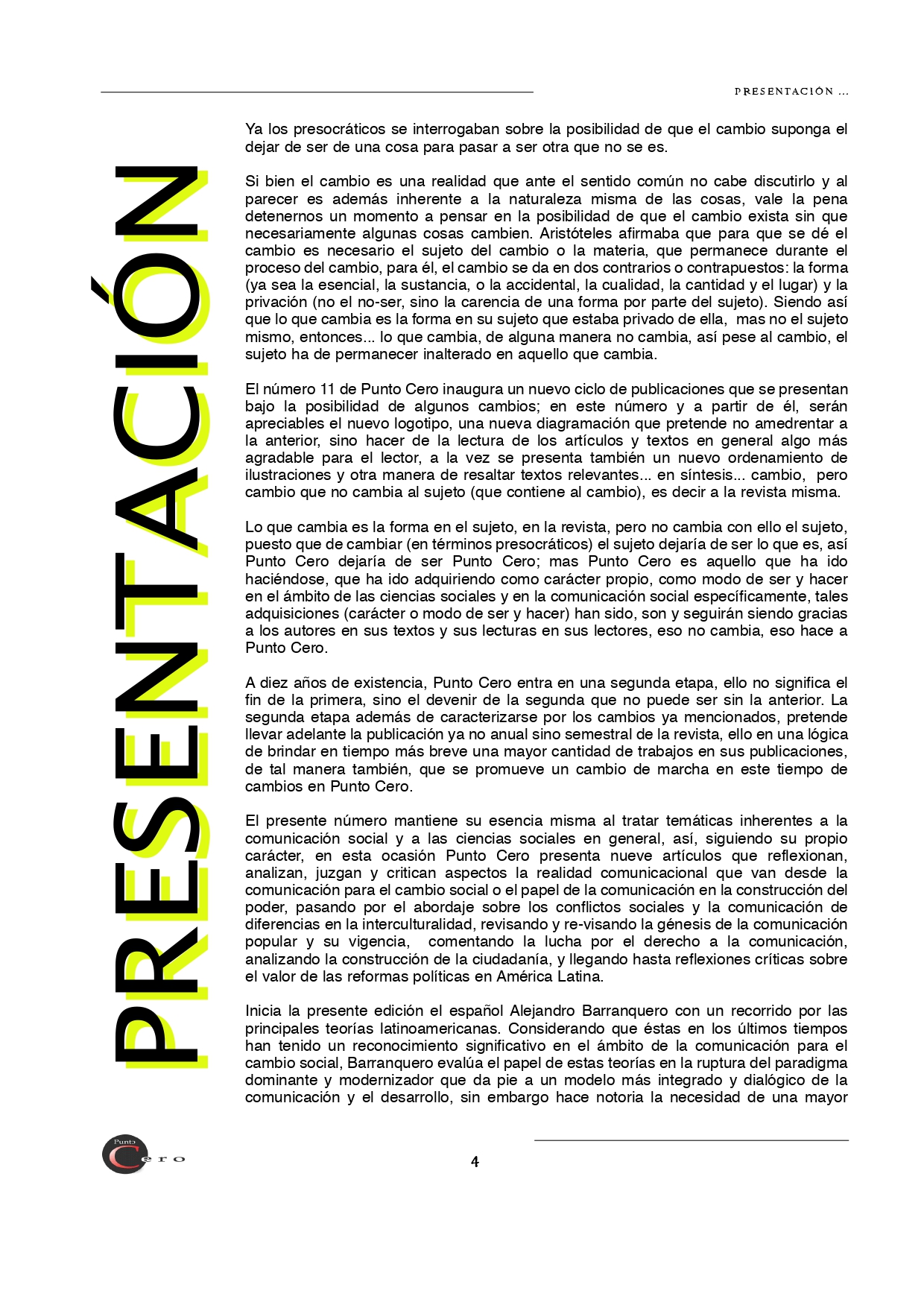 El número 11 de Punto Cero inaugura un nuevo ciclo de publicaciones que se presentan bajo la posibilidad de algunos cambios; en este número y a partir de él, serán apreciables el nuevo logotipo, una nueva diagramación que pretende no amedrentar a la anterior, sino hacer de la lectura de los artículos y textos en general algo más agradable para el lector, a la vez se presenta también un nuevo ordenamiento de ilustraciones y otra manera de resaltar textos relevantes... en síntesis... cambio, pero cambio que no cambia al sujeto (que contiene al cambio), es decir a la revista misma.