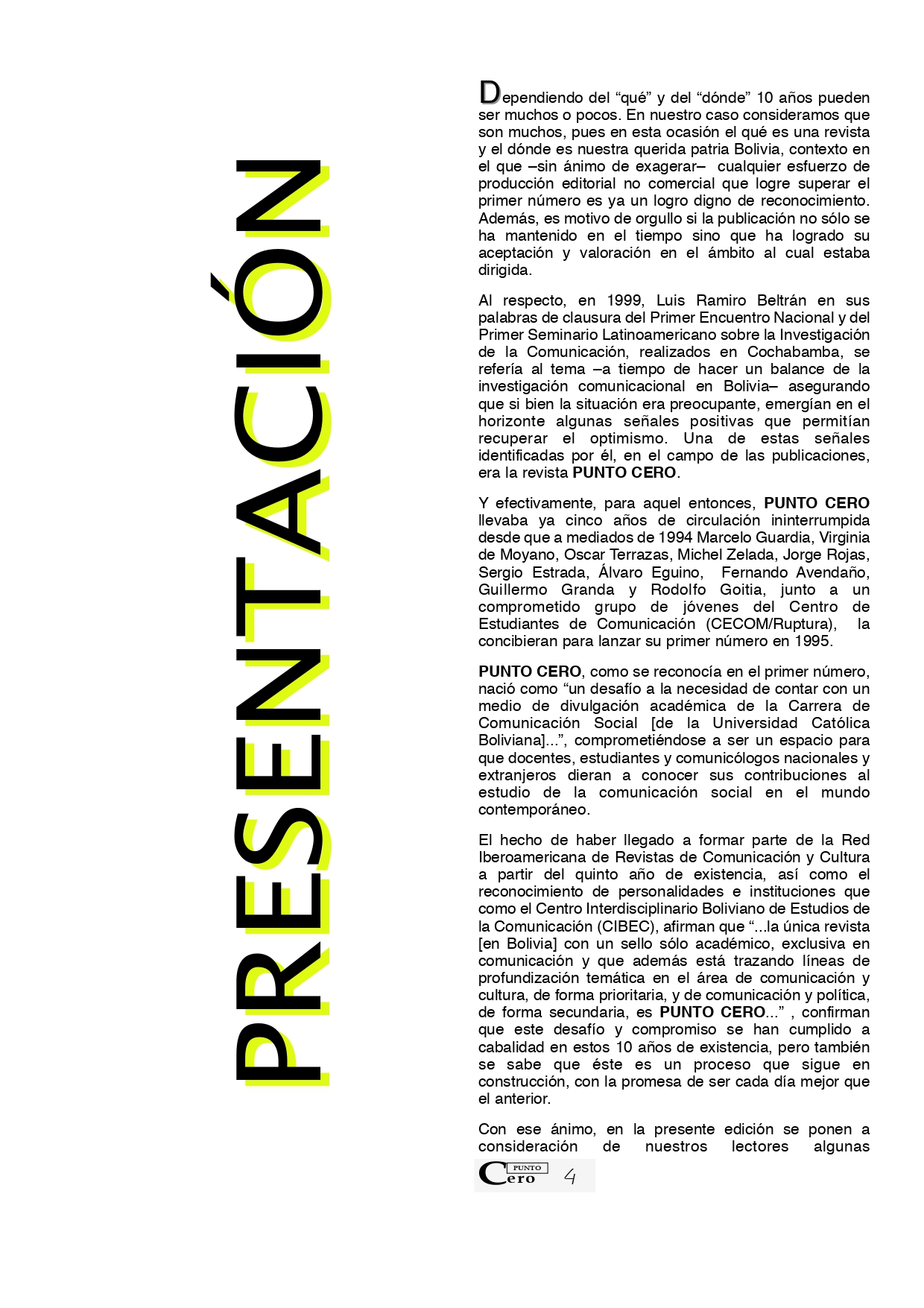 Dependiendo del “qué” y del “dónde” 10 años pueden ser muchos o pocos. En nuestro caso consideramos que son muchos, pues en esta ocasión el qué es una revista y el dónde es nuestra querida patria Bolivia, contexto en el que –sin ánimo de exagerar– cualquier esfuerzo de producción editorial no comercial que logre superar el primer número es ya un logro digno de reconocimiento. Además, es motivo de orgullo si la publicación no sólo se ha mantenido en el tiempo sino que ha logrado su aceptación y valoración en el ámbito al cual estaba dirigida.